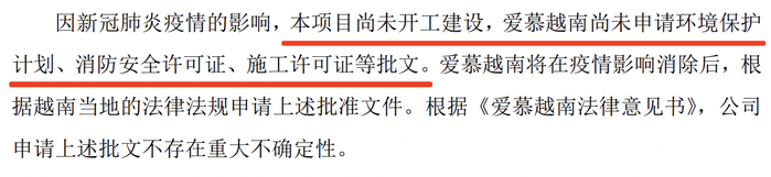 尽管新建越南生产基地有着较好的市场基础,不过,受疫情影响,该项目尚未开工建设,爱慕越南尚未申请环境保护计划、消防安全许可证、施工许可证等批文。