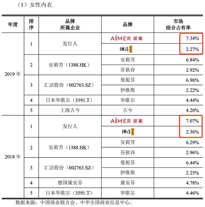 在女性内衣市场,爱慕股份旗下品牌“爱慕”、“爱美丽”的市场综合占有率从2018年的9.43%增长至2019年的9.61%;高端女性内衣市场,“兰卡文”的市场综合占有率从1.05%升至1.13%;男性内衣市场,“爱慕先生”的市场综合占有率从9.52%增至13.48%。