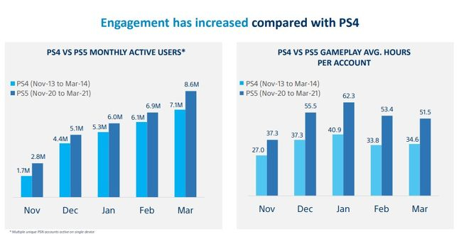 用户活跃度方面,索尼透露:在2021年3月份,PS5拥有860万月活跃用户,而PS4当月MAU则为710万。PS5的月活跃用户数之所以比主机销量更高,是因为某些用户拥有多个PS5账户。