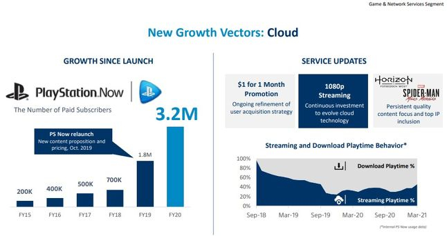 为了实现这个目标,索尼也许会加大对云游戏的投入力度。目前,索尼的PlayStation Now云游戏订阅平台已经拥有320万用户。PlayStation在2019年10月经历了一次重大更新,内容包括增添新游戏、降低订阅费用等,玩家可以通过该平台下载游戏,或者以云端数据的传输模式游玩。