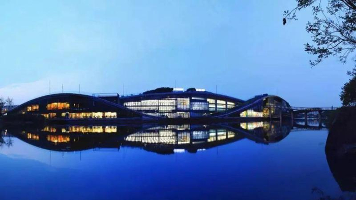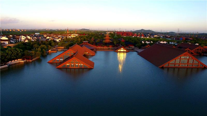 松江新城有这么一个湖,看似波澜不惊,实则激流暗涌,朝那水面拂一拂衣袖,也会带起五千年的回声,它就是——松江广富林湖。还未进广富林,便可从临近街道看到一大片的水上之城,一个个屋檐“漂浮”于湖面。这就是广富林文化展示馆项目中的文化展示区。这里包含文化交流中心、文化演艺中心和文化展示中心三个临湖而建的建筑,水没屋檐,寓意广富林文化随着退去的湖水逐步展现在世人的面前。