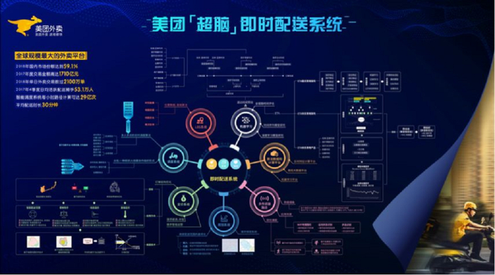 因此,美团很早就认识到科技的驱动力。从外卖开始孕育并最终诞生的,是一个全球最大规模、高复杂度的多人多点实时智能配送调度系统——美团超脑调度系统。这一智能调度系统通过全自动分单,在消费者、骑手、商家三者中实现最优匹配,而且要考虑是否顺路、天气如何、路况如何、消费者预计送达时间、商家出餐时间等很多因素,基于海量数据和人工智能算法,给最合适的配送小哥发送“最优配送指令”,确保平均配送时长不超过30分钟。在高峰时,美团智能调度系统每小时的路径计算次数达到了29亿次。