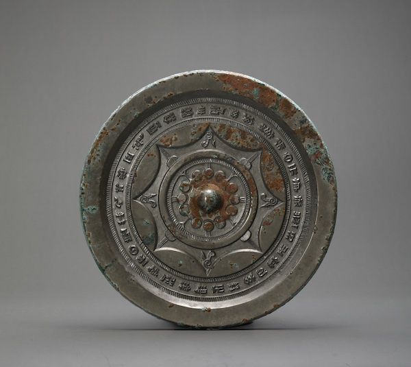 文化是交流互见的,铜镜文化亦不例外。中国铜镜受佛教影响甚深。早在东汉晚期,陶瓷器上便开始出现佛教塑像等些许痕迹,这种痕迹到三国吴时期开始在四叶八凤镜出现,四叶内有了带佛像、协恃乃至供养人的图像,十六连弧中也有了飞天。唐代海兽葡萄纹成为铜镜的典型组合纹饰,海兽(如狮子)和葡萄自西汉经丝绸之路,伴随佛教的传入而盛行。与传统蟠龙纹融合形成蟠龙海兽葡萄镜,此后逐步发展为纯海兽葡萄镜。到了元代,藏传佛教的兰查体真言便直接铸造于铜镜之上了。我们知道,早在汉代,中国铜镜便已流传至日本。《三国志·魏书·倭传》记载,日本邪马国遣使者到洛阳,魏明帝赠送了“铜镜百枚”。唐代,许多铜镜由遣唐使带回日本,并被神社、寺庙收藏。可见中国铜镜对日本文化的影响。但后来日本创造出了具有自身特色的铜镜——和镜。明末清初,又出现了日本铜镜的反向影响,江浙、闽南等地区出现了日本和镜以及仿制和镜,这与频繁的民间海上贸易相关。清代,福建沿海一带开始模仿日本和镜,制造出了中式和镜。