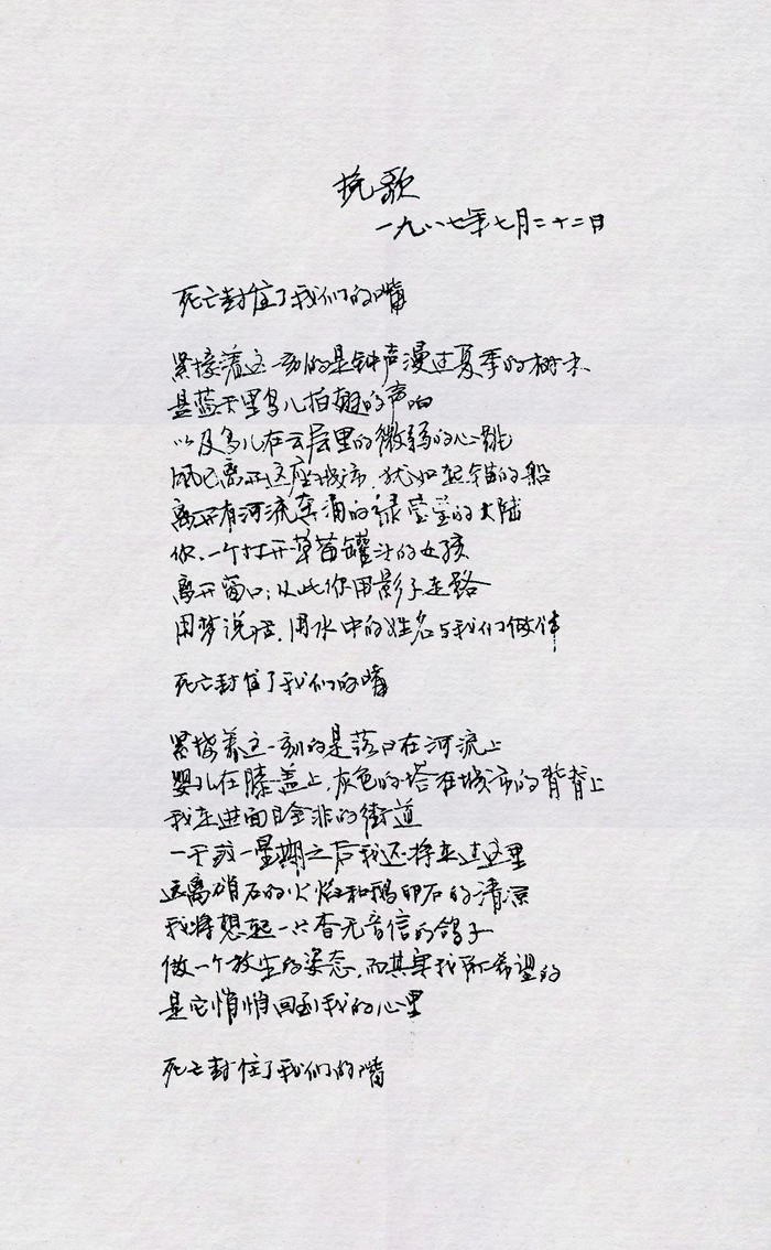 “我们那一届在北戴河,特别兴奋,结果过了头,(李)晓梅当天住进了医院。”欧阳江河在陪护到凌晨五点时,恍惚中写下了王燕生交待的命题作文,“就写在烟盒纸上,八十几行,誊抄时几乎没有改,就交上去了。”