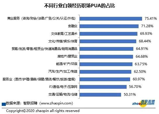 不同行业白领经历职场PUA占比(来源:智联招聘《2020年白领生活状况调研报告》)