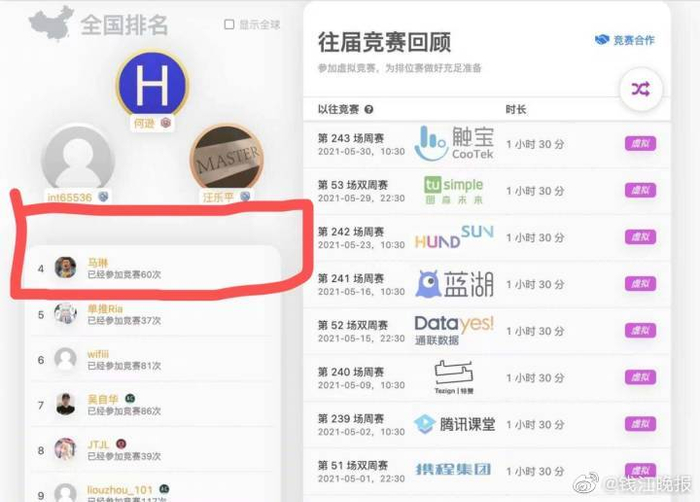 从截图看,“编程高手马琳”竞赛积分达到了3180,全国排名第4,全球排名11。