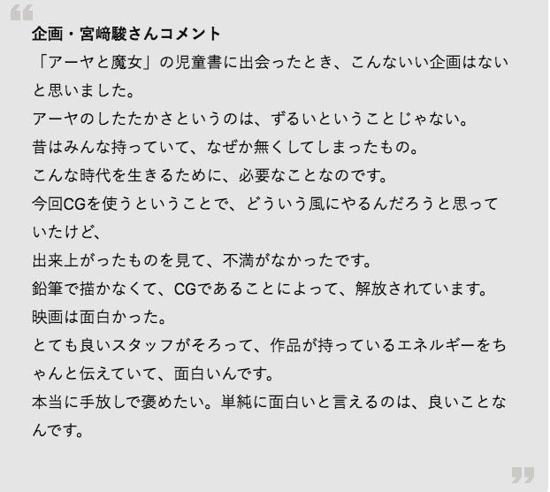 不过一向对儿子没好话的他,对《阿雅与魔女》的评价并不差。“我之前很好奇他们打算如何用CG展现这部作品。看过成品后,我没有任何不满意的地方。这是部很有意思的电影,我真想尽情赞美它。”