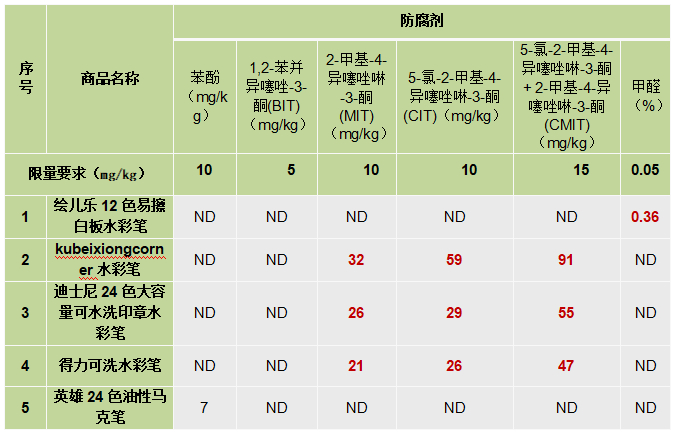 检测结果显示,绘儿乐、kubeixiongcorner、迪士尼、得力、英雄共5款样品检出防腐剂,其中英雄牌马克笔有检出,但符合相关标准要求,绘儿乐、kubeixiongcorner、迪士尼、得力4款水彩笔样品的防腐剂(甲醛、异噻唑啉酮类)则超出欧盟标准限量要求。