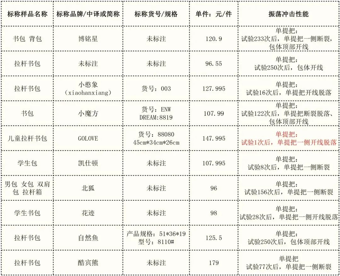 有7个批次明示执行标准为QB/T1333-2010《背提包》,标称品牌为“博铭星、小憨象、小魔方、凯仕顿、北狐、花迹、酷宾熊”的样品振荡冲击性能(单提把)在试验中均有不同程度的损坏;