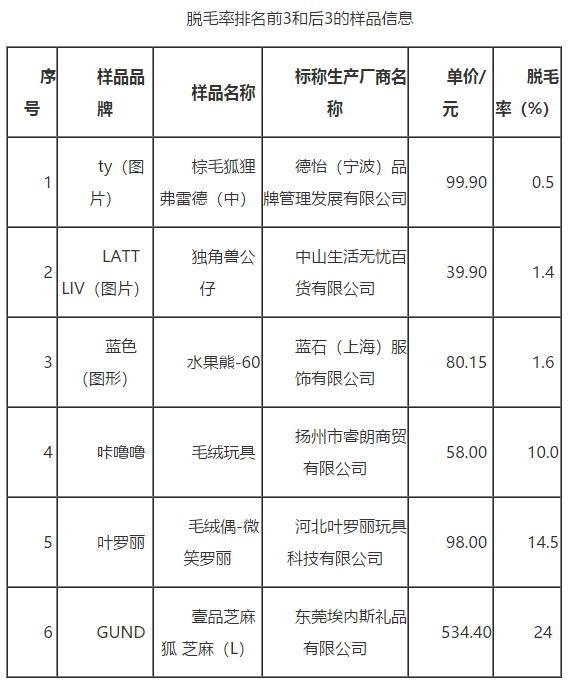 毛绒玩具均有脱毛情况出现,不同的毛绒玩具脱毛率存在较大差异,脱毛率最低为0.5%、最高24.0%。