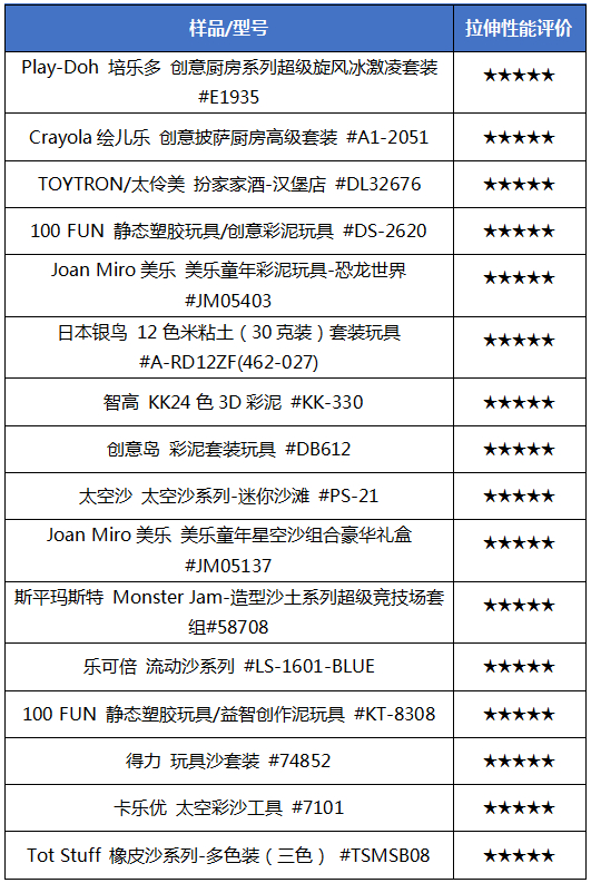 可塑性/拉伸性测试结果显示,传统橡皮泥和超轻粘土的造型能力表现出色,而太空沙由于材质松软特性,造型能力比传统橡皮泥和超轻粘土要差。水晶泥的拉伸性能也普遍较好,最长的可拉伸至3.1米。将通过安全性能指标的传统橡皮泥、超轻粘土和太空沙样品的造型能力表现进行星级排名,表现较好的评价3星及以上产品见下表,而水晶泥只有三款通过安全性能指标,不进行星级排名。