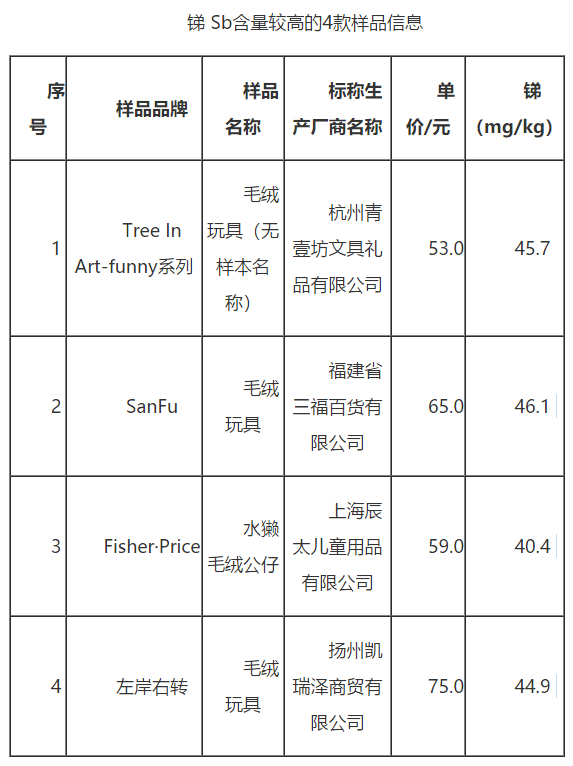 经测试,48款毛绒玩具特定元素的迁移均符合标准要求,其中砷As、钡Ba、镉Cd、铬Cr、铅Pb、汞Hg、硒Se均未检出,22款样品可迁移元素锑Sb有检出,4款样品检出值>40mg/kg(见下表),但在标准要求检出量≤60mg/kg的范围内,消费者可谨慎选择购买。
