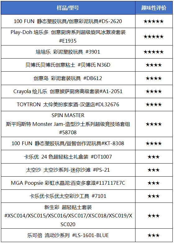 趣味性评价结果显示,传统橡皮泥、超轻粘土、太空沙总体比水晶泥好,有大型模印工具的样品更具趣味性,如雪糕机、糖果机。将通过安全性能指标的28款样品的趣味性表现进行星级排名,表现较好的评价3星及以上的产品如下表。