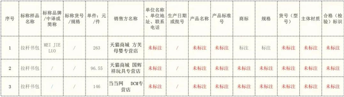 本次比较试验结果显示:在39个批次拉杆箱式学生书包中,有15个批次的样品标志存在不同程度的问题,其中存在比较严重问题的有3个批次,分别为: