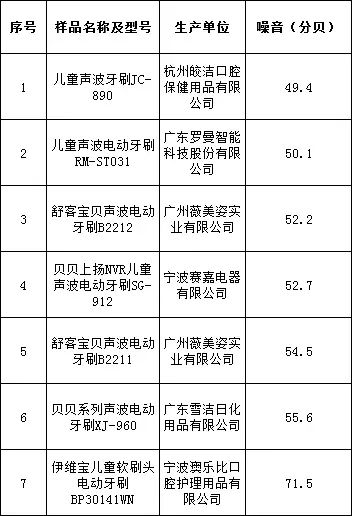 本次比较试验的7款样品中噪音最小的是杭州皎洁口腔保健用品有限公司生产的儿童声波牙刷,噪声为49.4分贝;噪音最大的是宁波澳乐比口腔护理用品有限公司生产的伊维宝儿童软刷头电动牙刷,噪声达71.5分贝,使用该款儿童电动牙刷就相当于小朋友在闹市区的马路上刷牙。