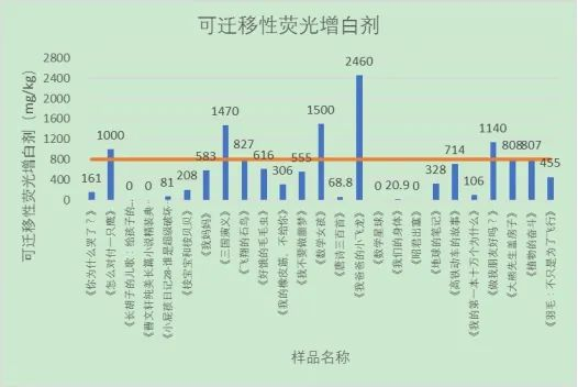 测试结果显示,4款儿童读物未检出可迁移性荧光增白剂,21款儿童读物检出可迁移性荧光增白剂,其中8款儿童读物的可迁移性荧光增白剂检出值超过标准要求的800mg/kg,不符合标准要求。