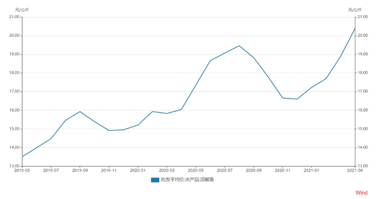 根据wind数据,自去年11月起,淡水鱼价格一路攀升,几乎没有回调。华安证券研报显示,5月21日,鲫鱼批发价24.17元/公斤,同比上涨31.57%;草鱼批发价20.60元/公斤,同比上涨48.09%。