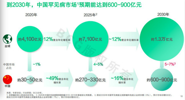 罕见病领域正在吸引越来越多的参与者和投资进入。波士顿咨询(BCG)的研究称,2030年全球孤儿药市场规模预计达到1940亿美元。而中国,以占全球市场份额5%~7%来估算的话,2030年将形成一个600亿~900亿元的市场。