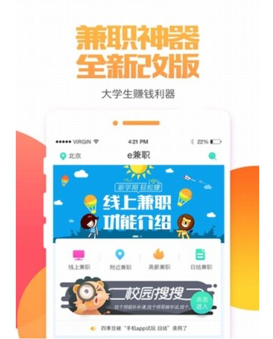 e兼职是一个大学生兼职信息O2O平台,2015年5月“e兼职”APP上线,2016年3月e兼职获得1500万Pre-A轮融资,资方为东方环球投资、恒宝金源投资以及两名个人投资者跟投。