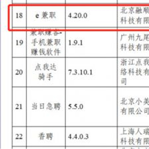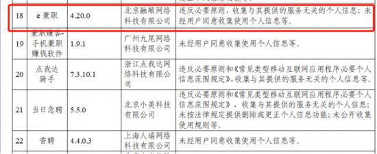 据显示,“e兼职”4.20.0版本主要有两大问题,一个是违反必要原则,收集与其提供的服务无关的个人信息;另一个是未经用户同意收集使用个人信息等。