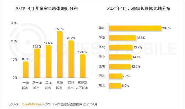 昨天刚过儿童节,今天Mr.QM就跟大家分享一下“儿童经济”洞察。QuestMobile数据显示,当前东部沿海和中部三四线城市有孩家庭分布更为集中,从占比上看,三线、四线、五线城市,儿童家长占比分别为25.3%、20.2%、12.6%,也就是说,近六成儿童家长位于三线及以下城市。