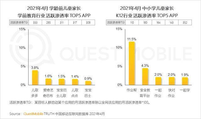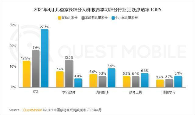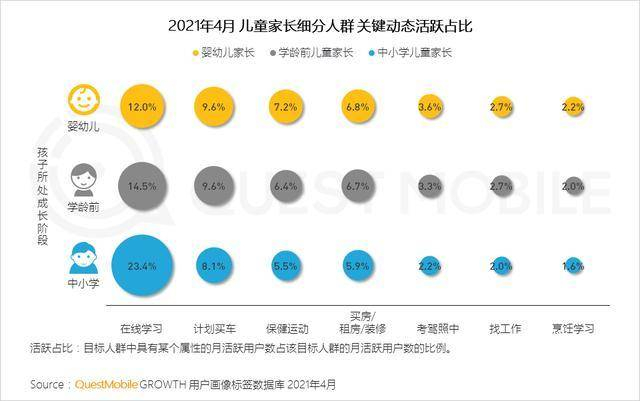 QuestMobile数据显示,婴幼儿父母考虑到后期孩子成长开始做长远打算,在保健运动、买房/租房、找工作、烹饪学习活跃占比更为突出;学龄前父母因孩子成长和出行需要,开始注重学习和买车、学车;中小学父母则开始大幅提升对于学习的关注,活跃占比高达23.4%。