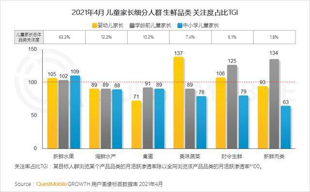 3. 不同阶段家长群体对于新鲜水果均有显著需求,在蔬菜和肉类方面因儿童成长需要呈现一定倾向差异。