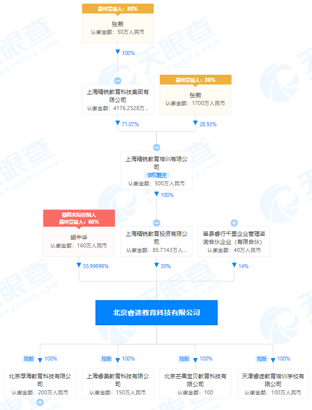 天眼查显示,睿途教育成立于2014年2月,胡中华是持股55.99999%的大股东,也是法定代表人、董事长、经理。上海精锐教育投资有限公司是其持股30%的二股东。而上海精锐教育投资有限公司是上海精锐教育培训有限公司的全资子公司。