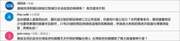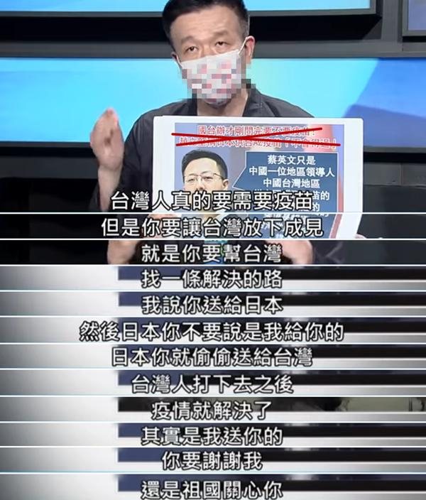 “台湾真的需要疫苗,但你要让台湾放下成见。大陆把疫苗先给日本,再偷偷(转)送给台湾。这样还要我教你吗?这样才有‘统战’的效果。”
