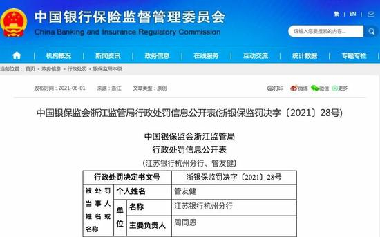 6月1日,银保监会浙江监管局公布的行政处罚信息公开表显示,江苏银行杭州分行存在要求信贷客户“存款回报”、向资本金比例不足且四证不全的房地产开发项目发放贷款、贷款用途管理不到位导致个贷资金被挪用等八项违法违规行为,浙江监管局对江苏银行杭州分行罚款235万元;对责任人管友健警告,并罚款5万元。