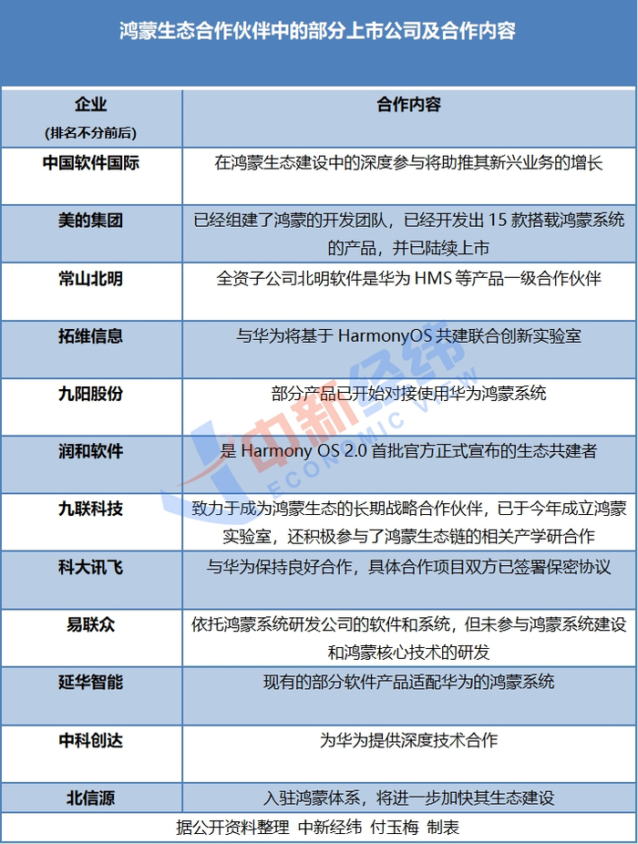据不完全统计,目前已有多家公司称是鸿蒙生态合作伙伴。华为表示,截至2021年5月21日,HarmonyOS生态已经发展了1000多个智能硬件合作伙伴,50多个模组和芯片解决方案合作伙伴,包括家居、出行、教育、办公、运动健康、政企、影音娱乐等多个领域的合作伙伴。其中不乏A股上市公司。