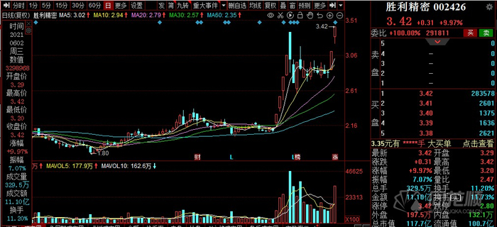 6月2日,胜利精密强势拉升至涨停,截至收盘封单28万手,报3.42元,当日成交11.1亿元,总市值117.7亿元,昨日胜利精密已收获一个涨停。