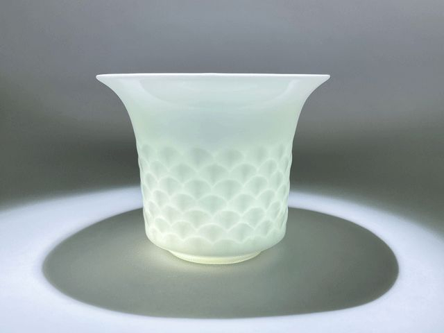 在玉泥制成的素胚上,用较为灵动的喷釉技法,施以青白釉,薄而均匀。1320℃的高温烧制后,成型的影青瓷,质地细腻,素肌玉骨,积釉处如湖光天境。