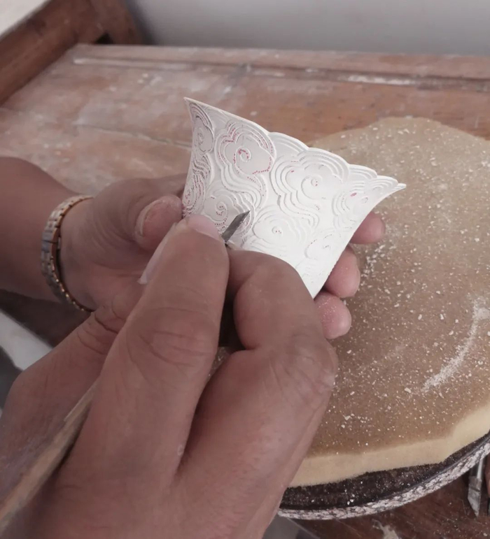 细看时,每一道纹样高度一致,却也有着各自手工的灵性,活泼而生动。纹样触感细润,又保留了一定的棱角,在手中摩挲时,手感甚佳。