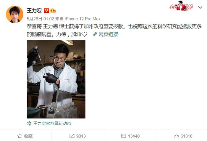 王力宏本人5月26日也通过实名认证微博账号刊文:“恭喜哥 王力德博士获得了加州政府重要拨款。也祝愿这次的科学研究能拯救更多的脑瘤病童。力德,加油。”并附上了王力德从事研究的照片。