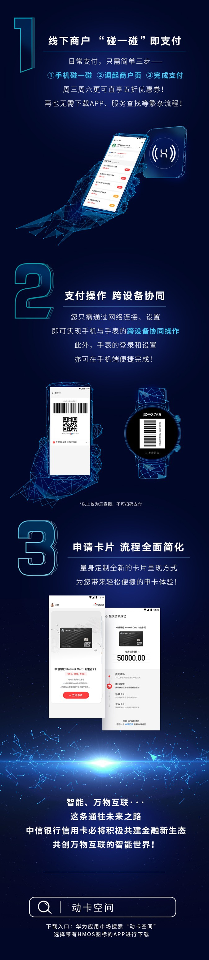 (4)动卡空间APP(HarmonyOS版)V1.0版:这是信用卡行业首批HarmonyOS系统原生APP,该应用覆盖目前全部的信用卡基础服务,包括申卡、开卡激活、查账还款、额度管理、积分管理、分期服务、信收付、生活服务等,充分发挥HarmonyOS的架构优势,为用户提供更加顺畅、稳定的信用卡服务。近期,用户将可在华为应用市场搜索“动卡空间”下载体验。