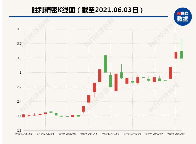 受此消息刺激,6月1日和2日,胜利精密股价连续两日涨停,市值暴增20亿。