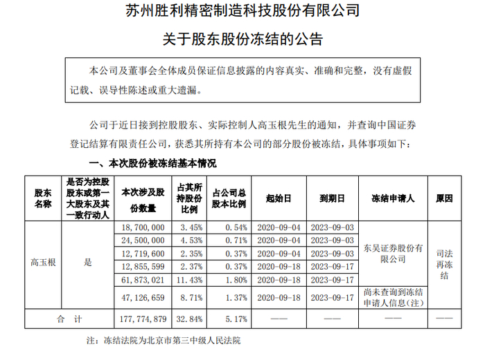 5月18日,胜利精密也发布公告称,公司控股股东高玉根持有的部分公司股份于2021年4月8日在淘宝网司法拍卖网络平台上进行公开拍卖,拍卖股份累计约1.15亿股,占公司总股本的3.35%,相关股份将以司法划转(非交易过户)方式进行过户。其中,约2824.63万股(占公司总股本的0.82%)已收到法院的执行裁定书并已完成股份过户手续,8699.72万股(占公司总股本的2.53%)已收到法院的执行裁定书。