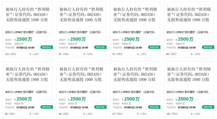 据阿里拍卖微信公号6月3日消息,日前,江苏省苏州市中级人民法院在阿里拍卖上挂出一批股权,将于7月1日10时至7月2日公开拍卖“胜利精密”(证券代码:002426)无限售流通股8000万股股票。