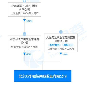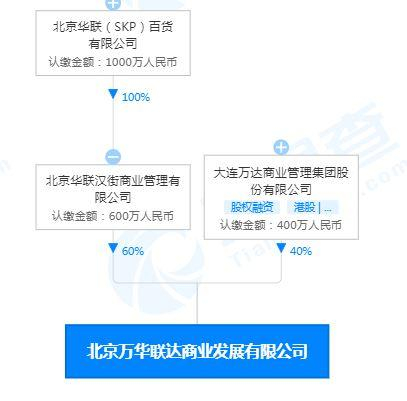 资料显示,北京万达联达商业发展有限公司注册成立于2021年4月12日,注册资本1000万元,目前由北京华联汉街商业管理有限公司持股60%,大连万达商业管理今天股份有限公司持股40%。而北京华联汉街商业管理有限公司由北京华联(SKP)百货有限公司100%持有。