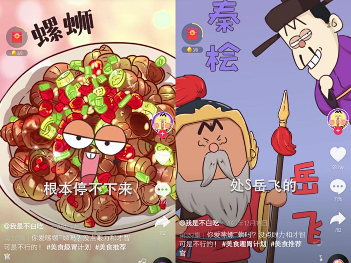 “我是不白吃”是抖音一个美食动漫IP,被设计为可爱搞笑又懂吃的小专家,目前粉丝1800万,年美食订单高达46万份。账号创立者朱宇辰系北京电影学院动画专业毕业。去年1月,他一个娓娓讲述智利西梅生长过程的短视频,在上线一小时后即出现断货。供应商万没想到动画人物有如此带货实力,因备货不足又难以迅速调货而懊悔不已。