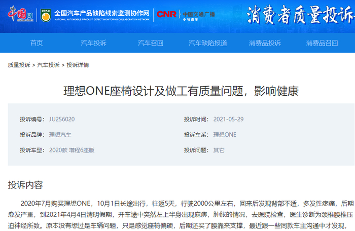 来自西安的车主常女士投诉称,2020年7月购买的理想ONE,行驶2000公里左右后发现背部不适,多发性疼痛,后期愈发严重。原本没有想过是车辆问题,只是感觉座椅偏硬,直到2021年4月清明假期,开车途中突然左上半身出现麻痹,去医院检查诊断为颈椎腰椎压迫神经所致。
