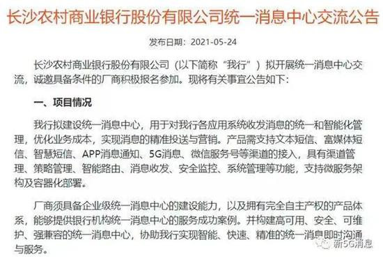 公告显示:该行统一消息中心产品需支持文本短信、富媒体短信、智慧短信、APP消息通知、5G消息、微信服务号等渠道的接入。