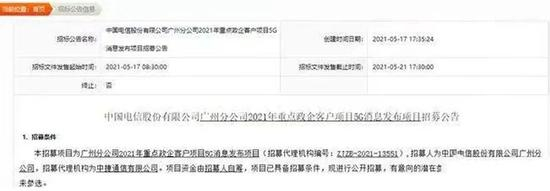 中国电信5月17日发布中国电信股份有限公司广州分公司2021年重点政企客户项目5G消息发布项目招募公告。