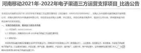 中国移动5月26日还发布了“河南移动2021年-2022年电子渠道三方运营支撑项目比选公告”。