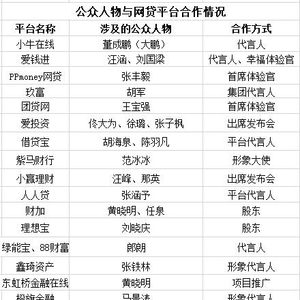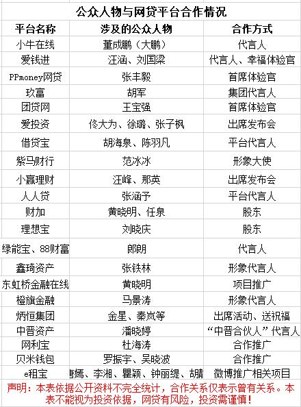 《国际金融报》记者依据公开信息不完全统计,有20多家网贷平台与数位明星、公众人物有过合作。自2014年以来,先后有e租宝、中晋资产、理想宝、88财富、理想宝、团贷网、网利宝、爱钱进、有利网等网贷平台爆雷,牵涉其中的明星包括黄晓明、范冰冰、汪涵、杜海涛、王宝强、郎朗、杨迪等人。