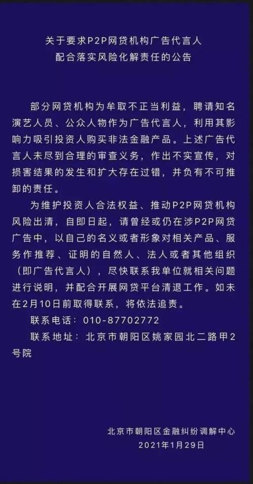 此前的1月29日,北京市朝阳区金融纠纷调解中心发布公告称,部分网贷机构为牟取不正当利益,聘请知名演艺人员、公众人物作为广告代言人,利用其影响力吸引投资人购买非法金融产品。上述广告代言人未尽到合理的审查义务,作出不实宣传,对损害结果的发生和扩大存在过错,并负有不可推卸的责任。