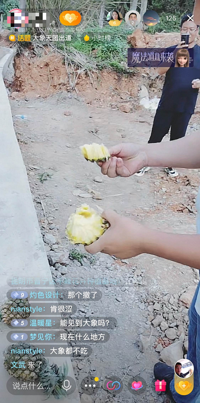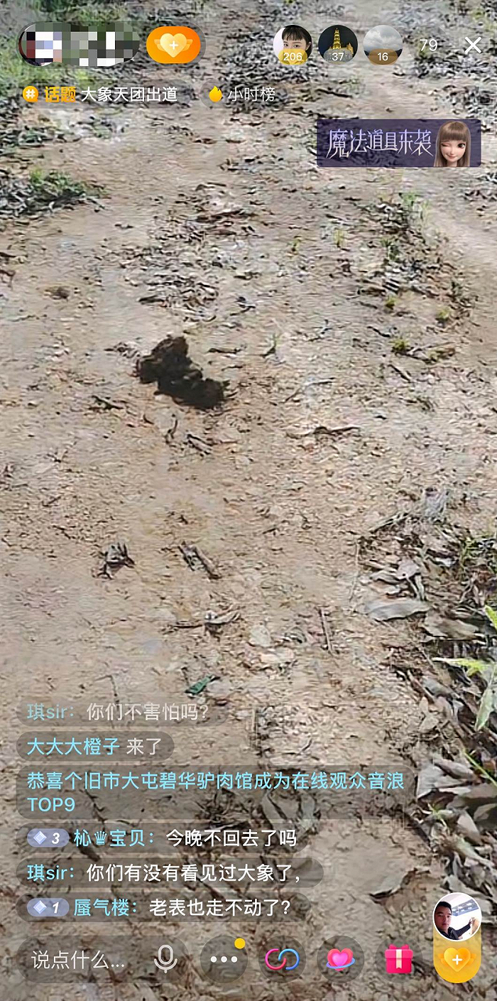 迅速聚集的热度和流量,引来了大批野生主播。他们蹲守在大象迁徙的途经地点,直播吃大象吃剩下的菠萝,直播看大象的脚印与粪便,甚至不顾危险跑进大象停留的山林,近距离拍摄大象的行踪。