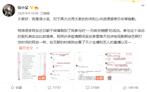 活动微博一经发出,迅速引发关注,相关话题一度登顶热搜,反转发生在仅仅五个小时后。“超级主播KING”被发现盗用另一公司资质,迅速封号。彼时,那条抽奖微博转发量已突破一百万,话题阅读量破五亿,信小呆在第二天做出解释和道歉,并自费五万调整抽奖活动。
