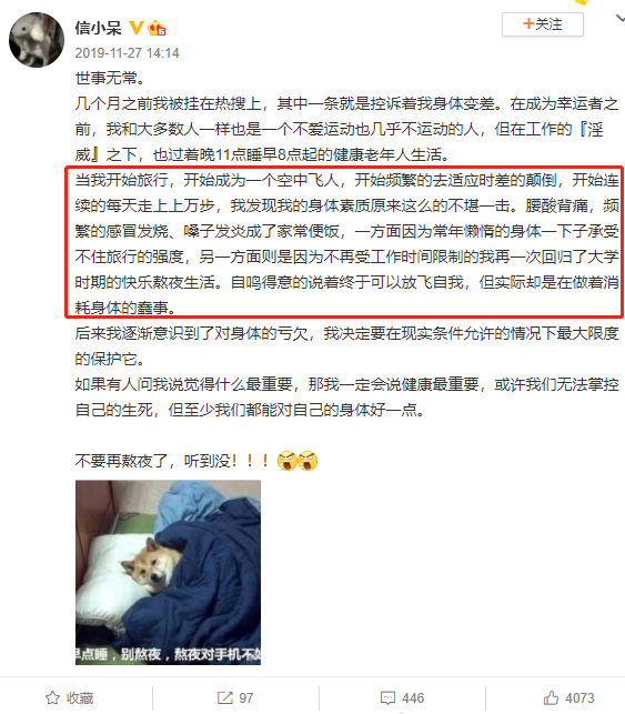 不止财务出现危机,连身体也吃不消。信小呆曾经在采访中说到,她的大部分旅行都是走马观花,很多时候只能睡2~3个小时,身体承受不住旅行的强度,频繁生病。